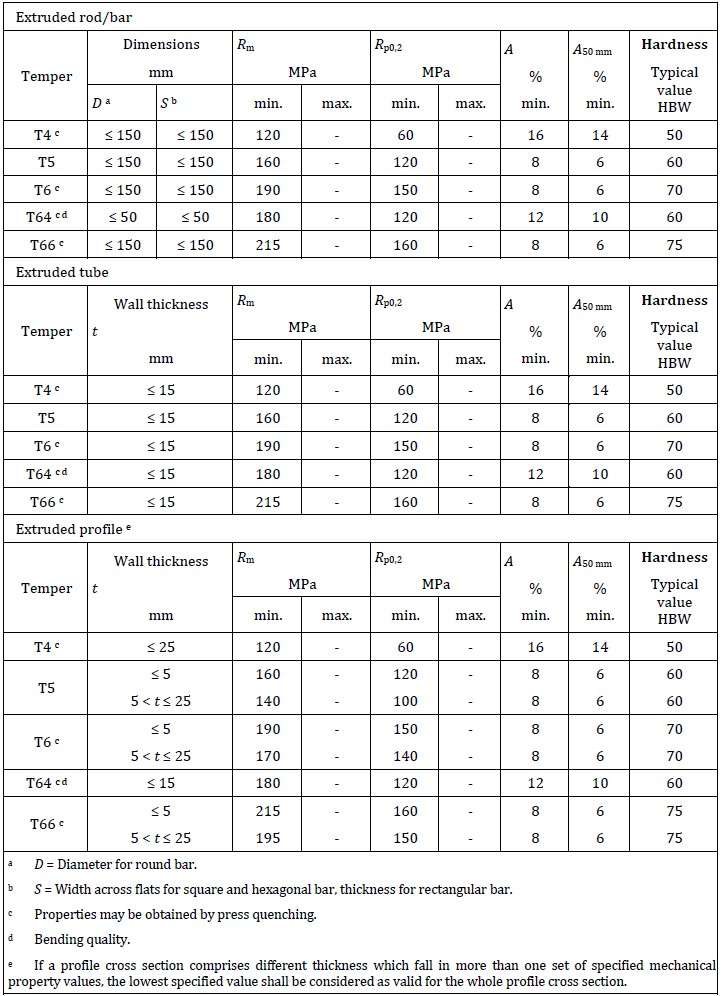 Table 2 – Requirements of EN 755-2 to mechanical properties