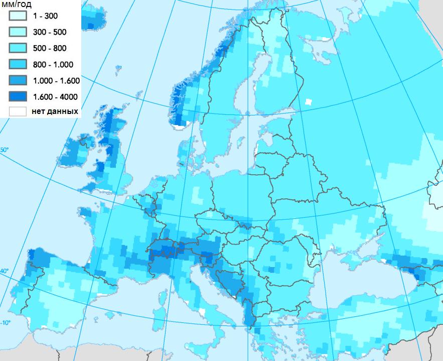 Can be seen, what about the amount of precipitation, for example, in Germany or Poland, is 500-800 mm, what in 2-2,5 times less than, than half of the UK regions.