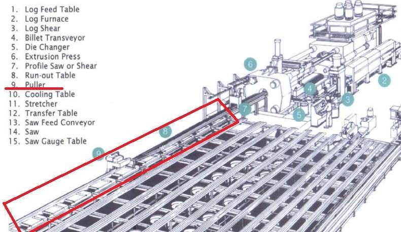 - The combination of the main and auxiliary puller puller. The main puller pulls the profile during the press cycle, and the auxiliary puller drove the profiles already cut more by the output roller conveyor for transfer to a cooling table.