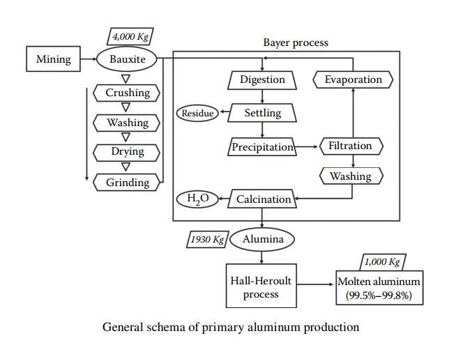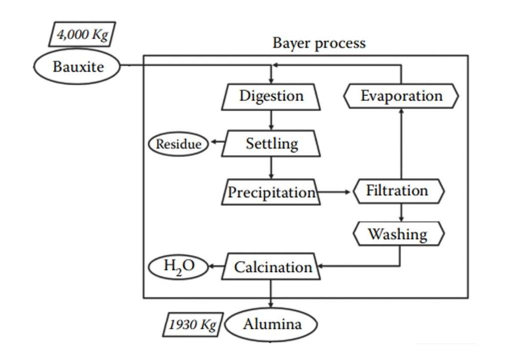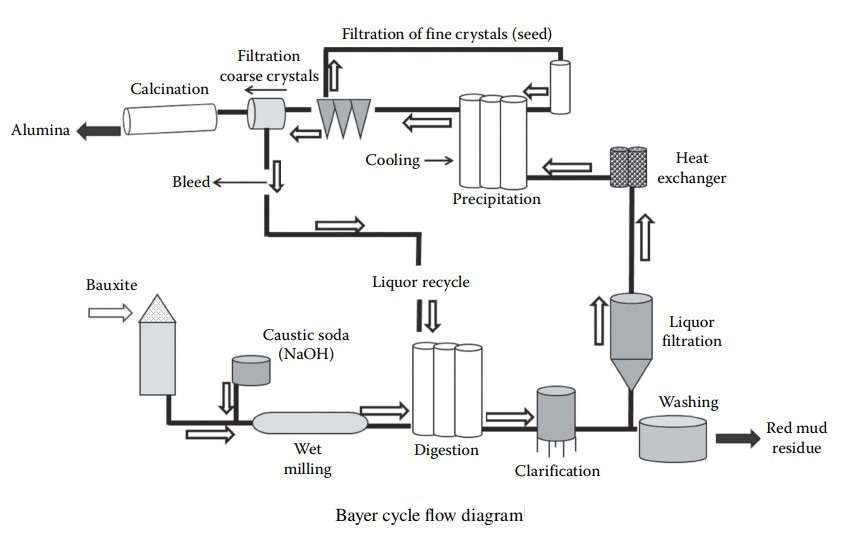 A general schema of Bayer process in the production of primary aluminum is displayed in this figure. First, the bauxite is digested with caustic soda, also called the leaching of bauxite. During this process, the alumina is dissolved in sodium hydroxide forming hydroxide aluminate, and the insoluble particles form a red mud.