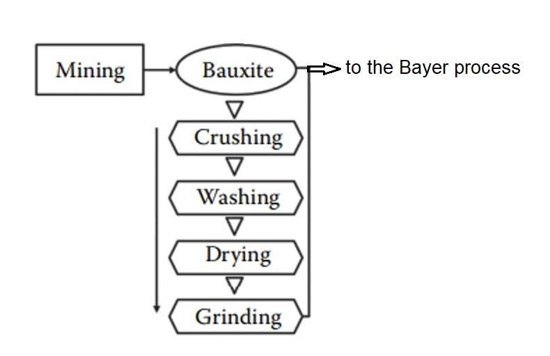 Prior to the Bayer process, the bauxite needs to be crushed and ground to small particles. Crude bauxite ore is crushed or ground in ball mills. This crushed bauxite is first washed to remove all the fine particles coming mainly from the clay.