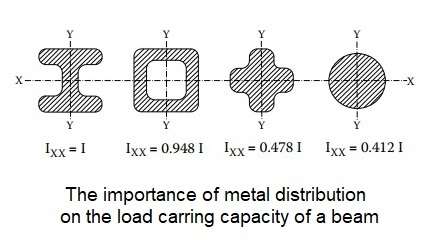 The strength and stiffness of the casting will be maximized by locating material where it is needed while avoiding unnecessary bulk and weight. Figure 1 illustrates the importance of metal distribution on the load carring capacity of a beam. All four sections have the same area and weight, and all exept the round shapehave the same width and height. Note that the cross and round sections have only about 50 percent of the rigidity of the I-beam.