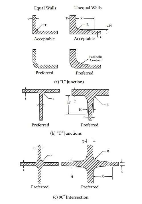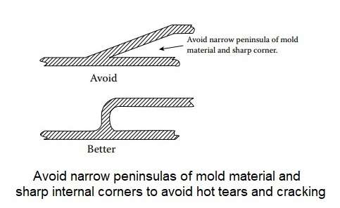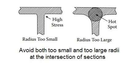The corners of all intersections and junctions should have fillet radii. The size of the fillet radii used must often strike a balance between stress concentration and the possibility of a hot spot. The small filler radius inhibite the flow of molten metal during filling and also can cause cracking during cooling or use of the casting.