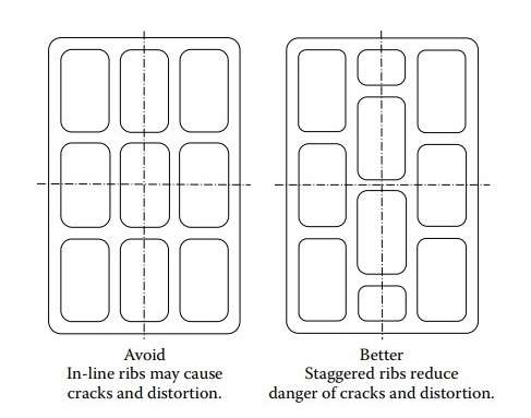 Weight of the casting can be reduced by designing the casting by utilizing a minimum uniform wall thickness everywhere in the casting. There are a variety of design approaches to use of thinner walls, for example, the use of ribs as shown in Figure 3.