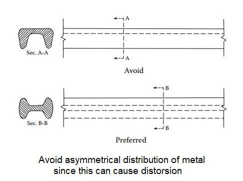 Similar effects will occur if different sections of the casting cool at different rates or if the distribution of metal is asymmetric. The best way to avoid hot tears and distortion is to avoid asymmetrical distributions of metal and to use a uniform wall thickness everywhere.