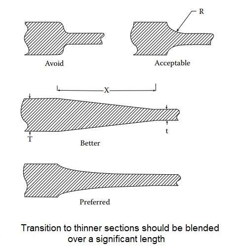 When this is not possible, transitions to different section thickness should be carefully designed so that the degree of constraint imposed on the solidifying casting is minimized.