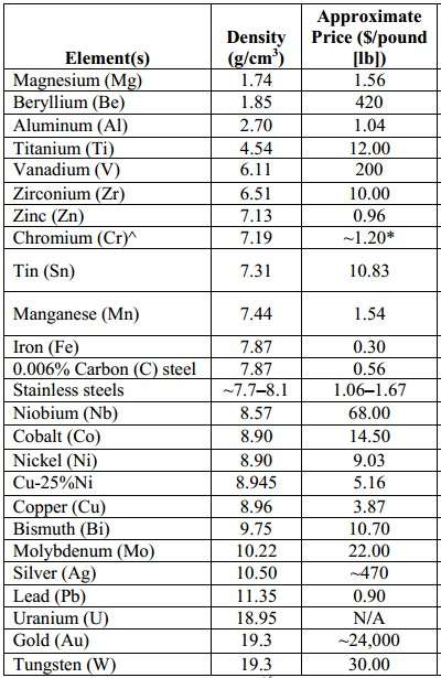 density and cost (in US dollars per pound)