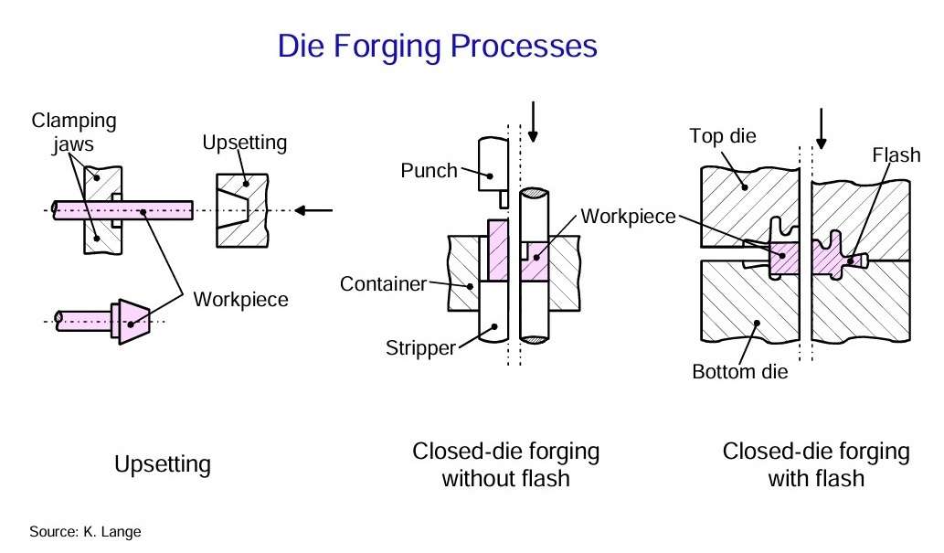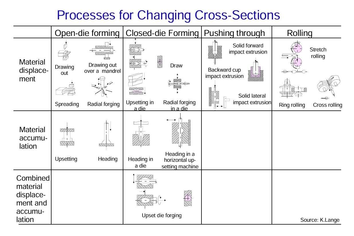 The processes for changing cross-sections build-up the fundamentals of forging. According to the law of constant volumes, changes in cross-section lead to corresponding changes in length. The cross-section can be changed by material displacement and material accumulation, whereby the processes of material displacement dominate.