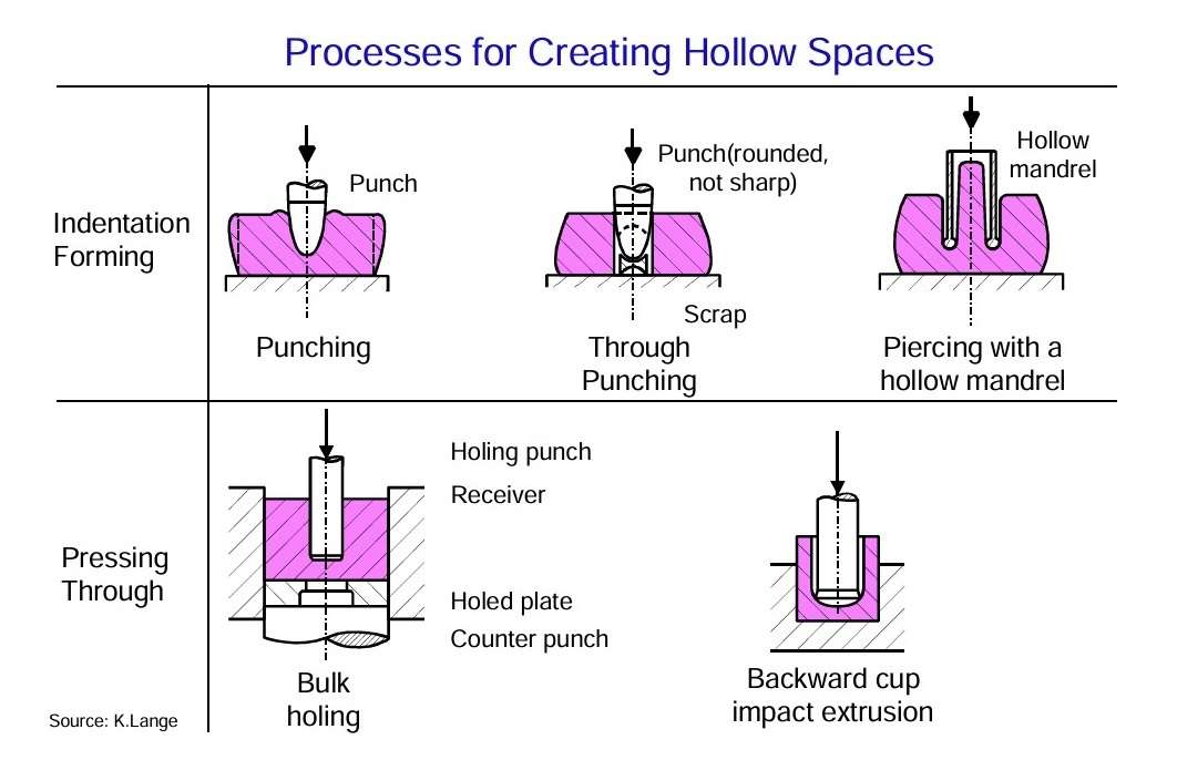 Hollow spaces (cavities) are produced by the methods of indentation forming and extrusion forming.