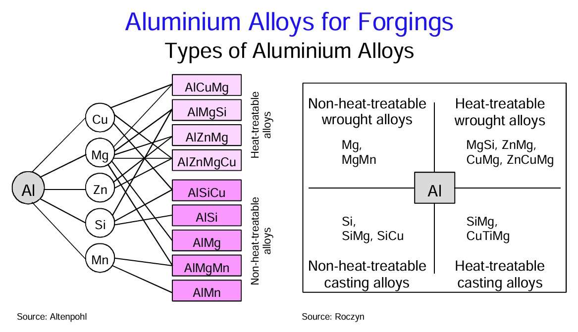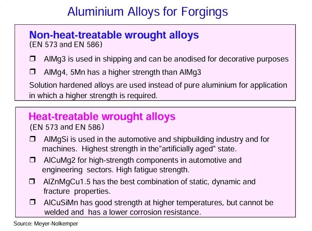 A large number of aluminium alloys, ranging from pure aluminium up to the highstrength aluminium alloys, can be forged effectively. All alloys standardised in the EN 573 and EN 586 may be used. Forgings are mainly used for structural engineering parts, so that aluminium forging alloys are mostly of the heat-treatable type with medium to high strength.