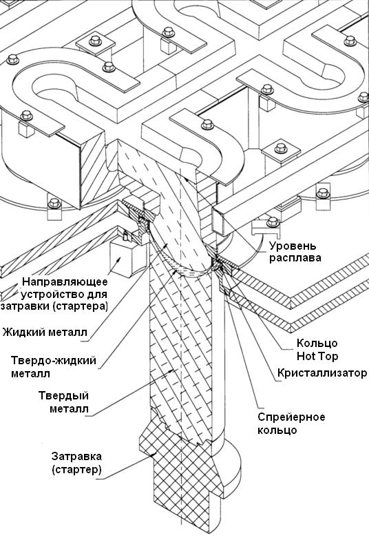 • Closed casting (hot top casting). It has several modifications and is widely used.
