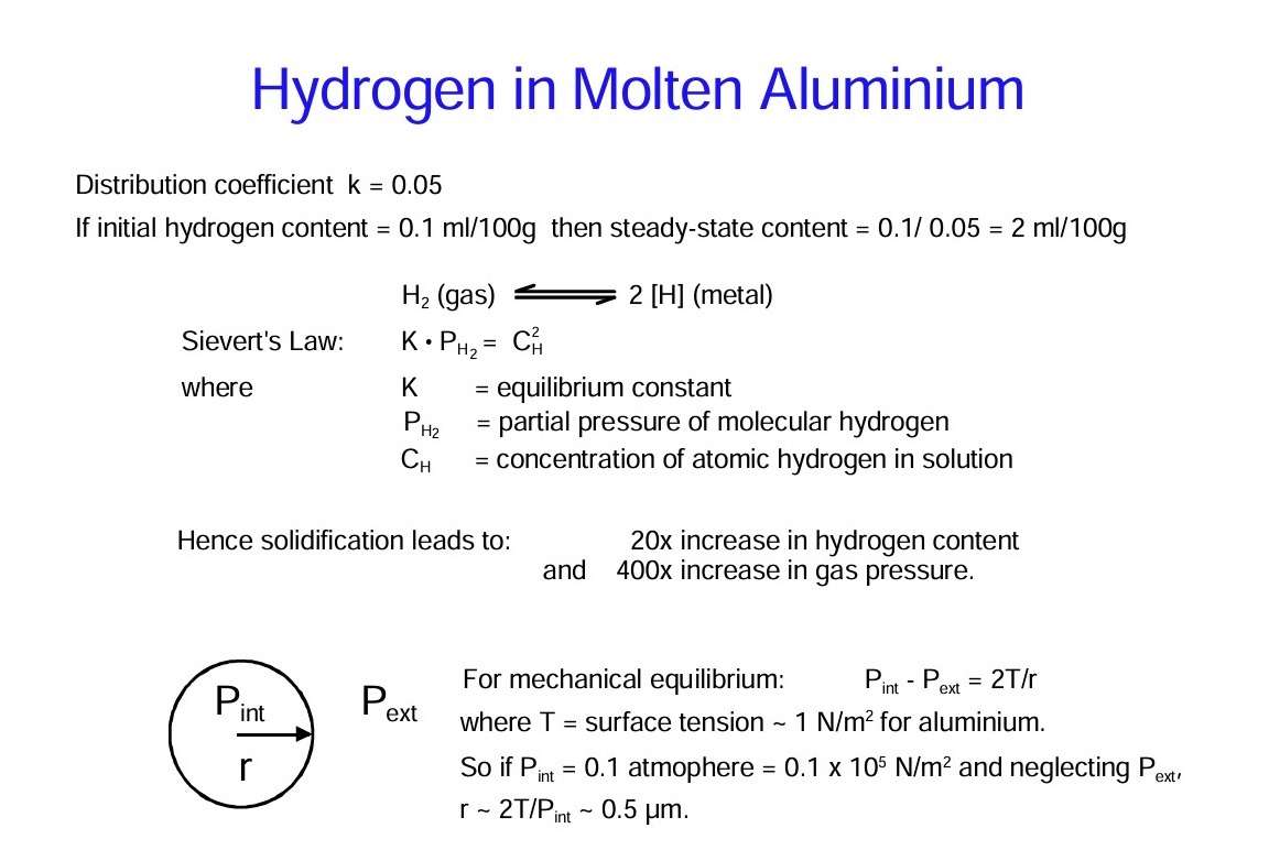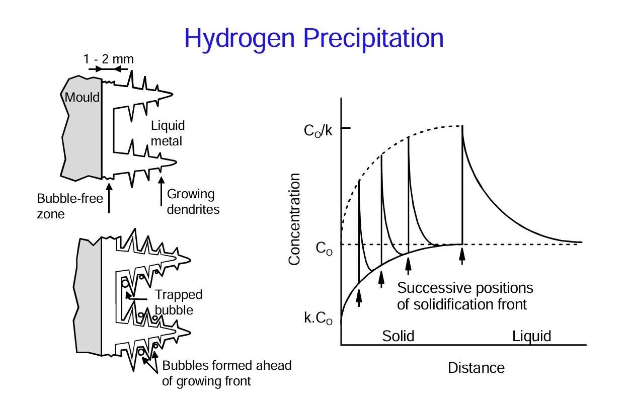 Figure 6 shows the behavior of hydrogen in molten aluminium. Solidification leads to an increase in the amount of hydrogen dissolved in solution of 20 times. Thus if the initial gas content is 0,1 ml/100 g, which is not particularly high, the hydrogen content at the interface would be 2 ml/100 g once steady state is reached. This value is above the solubility limit and thus the liquid aluminium is supersaturated with hydrogen.