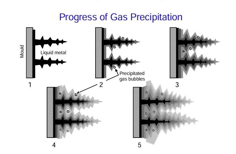 Figure 5 shows a schematic view of a section through a solidifying casting with the mould on the left-hand side, a solidified layer about 1 – 2 mm thick which is free from gas bubbles, and then the dendritic growth front. As further growth of the dendritic front occurs, we find that small hydrogen gas bubbles are precipitated and become trapped in the dendrite forest.