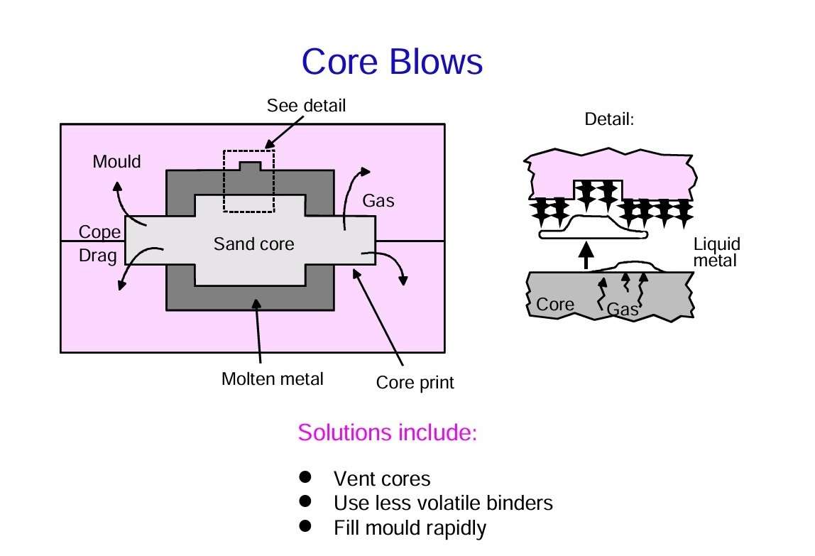 - Finally, the sand binders used to make the moulds and cores often break down when in contact with the molten metal and the gaseous decomposition products can force their way into the solidifying metal, leading to defects which are normally known as ‘blows’.