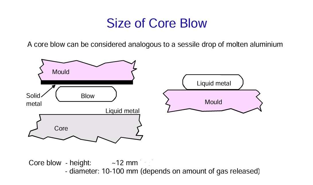The minimum thickness of the bubble in a liquid aluminium alloy when lodged under a horizontal flat surface is usually approximately 12 mm. This dimension is controlled by the ratio of surface tension and density. The diameter of the bubble can of course be any size, depending on the amount of gas released by the core, and is typically 10 to 100 mm.