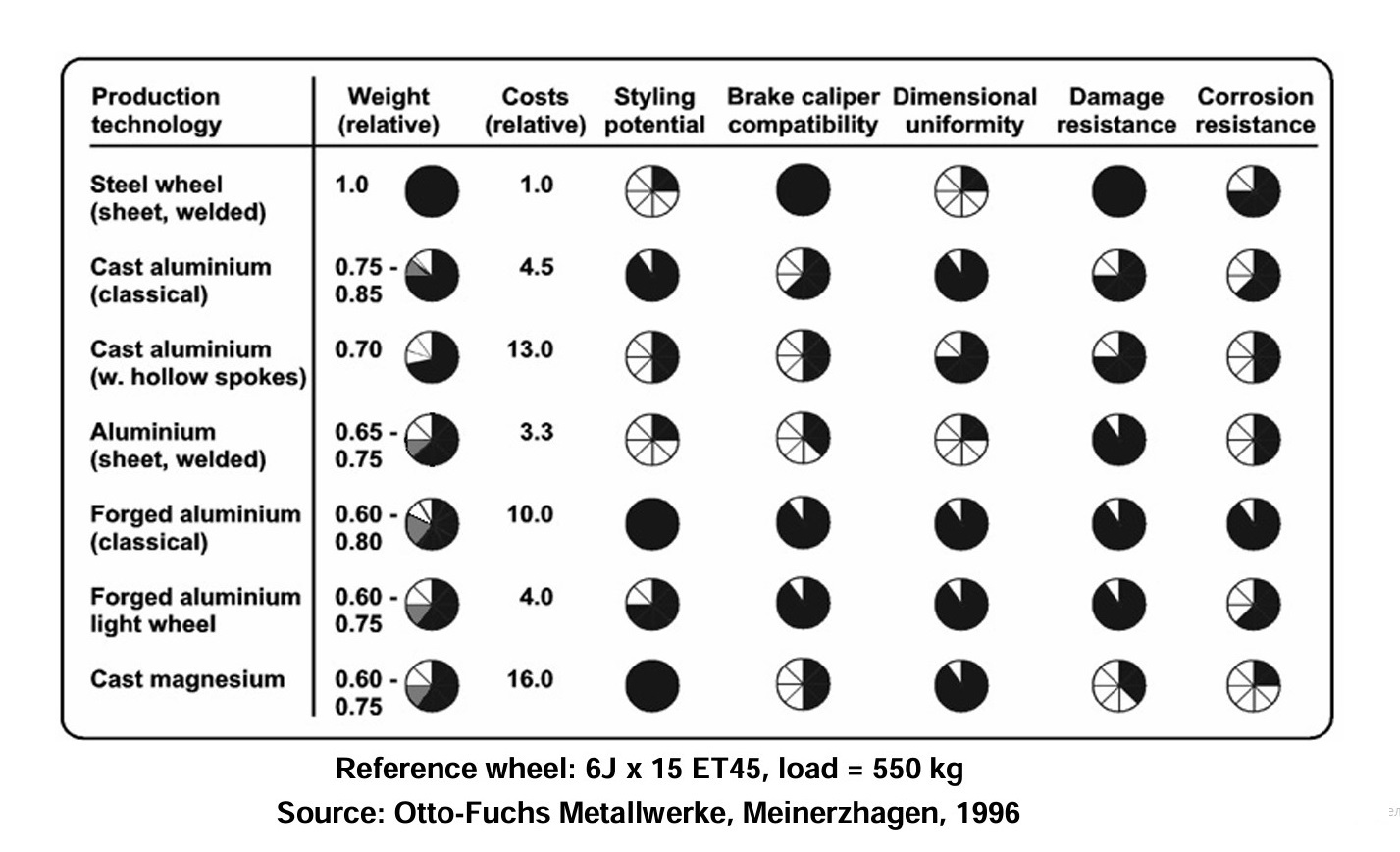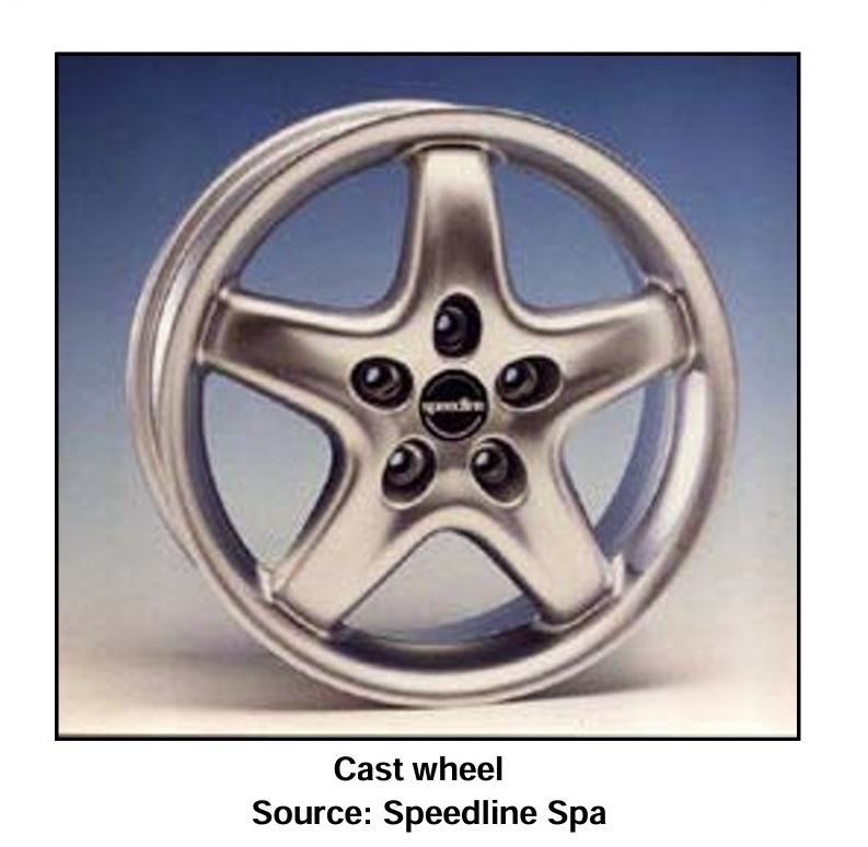 The main advantage of cast aluminium wheels is the high styling versatility. Cast wheels also offer a high dimensional accuracy (i.e. homogeneous mass distribution) and adequate static and dynamic mechanical characteristics. An important reason for choosing cast aluminium wheels is their attractive visual appearance. The weight reduction potential compared to steel wheels is a benefit, but often not the major objective.