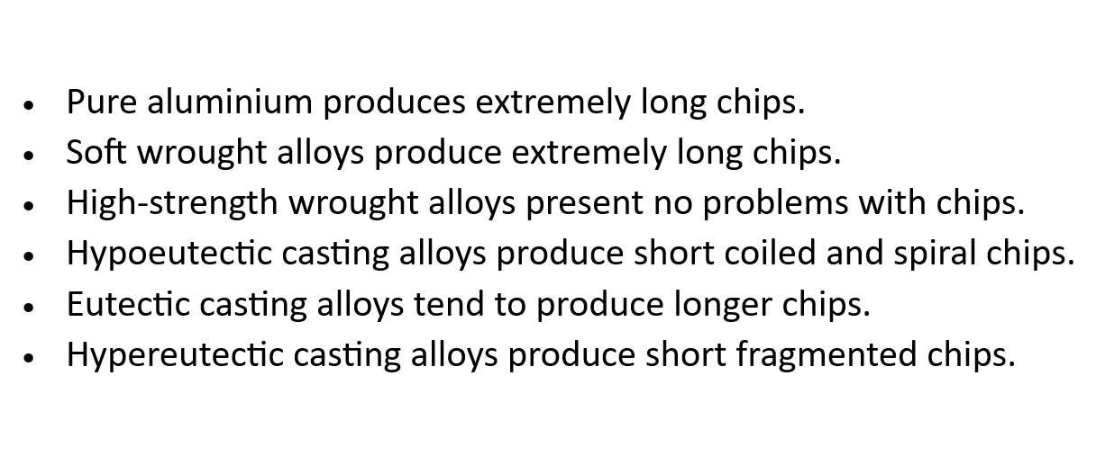 • Hypereutectic casting alloys produce short fragmented chips which may be difficult to remove.