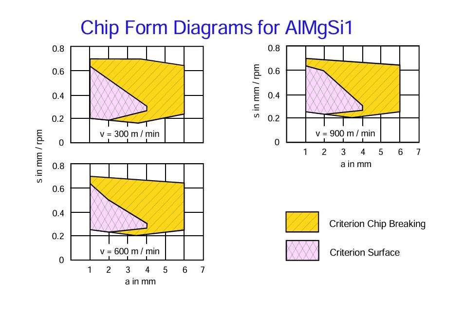 Chip form diagrams can be compiled, thereby making it possible to consider the machining criterion „form of chips“ in setting up the cutting routine. These diagrams show the regions for best chip forms as a function of the variables cutting speed, feed and depth.