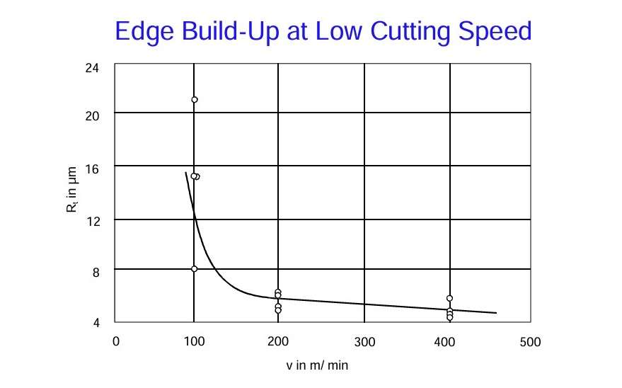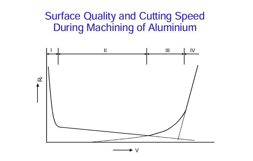 The cutting speed is an important machining parameter which influences the surface quality. In general, the roughness is inversely proportional to the cutting speed. The region of low cutting speeds must, as a rule, be avoided when aluminium is to be machined. Edge build-up is a phenomenon which is typical for aluminium and is caused by the periodical sticking and removal of aluminium particles deposited on the cutting tool.