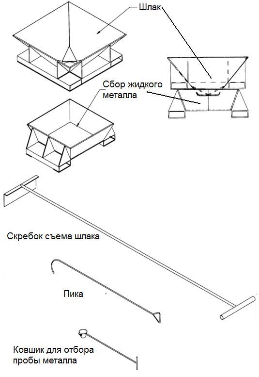 The simple tools required for furnace operations are shown in Figure 1. These tools are required for handling scrap in the furnace, removing slag, cleaning the furnace, and collecting samples for spectral analysis. All of these tools have a limited service life and are therefore considered consumables. They are usually made directly at the factory.