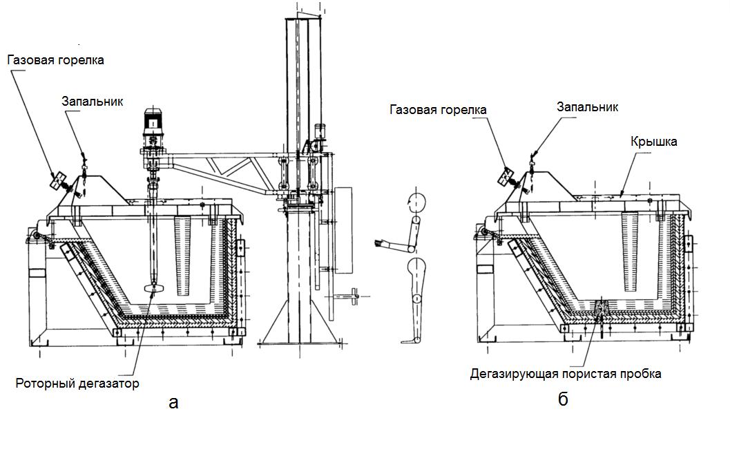 In large industries, out-of-furnace degassing is often used in the technological transfer line of the aluminum melt from the melting or holding furnace to the casting machine. These degassing systems are more efficient than oven degassing. For example, they are capable of reducing the hydrogen content in the melt by more than 60%. Figure 3 shows two types of such degassing systems – rotary and with blowing through a porous plug.