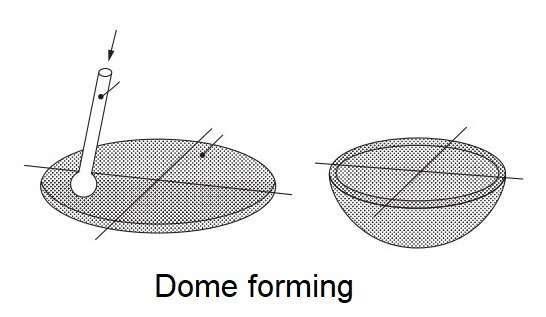 In this process, a dome is formed from a sheet metal blank by local stretching made by multiple blows from a rounded hammer-shaped tool. The process, which is very flexible, can be carried out as well by hand as in special machinery.