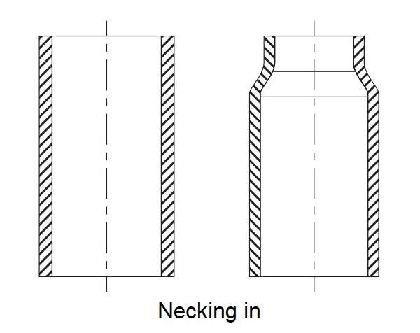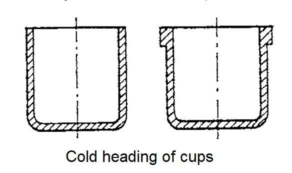 In this process, the rim of a cup is reduced in length and increased in thickness with the aid of two counteracting tools.