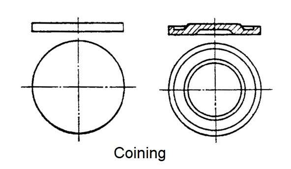 The manufacture of coins, tokens, etc , can be considered as well a sheet metal forming process as a bulk process The process takes place in special presses and highly loaded tools, often with a ring around the upper and lower coining tool, to increase the hydrostatic pressure in the process and to improve the coining precision.