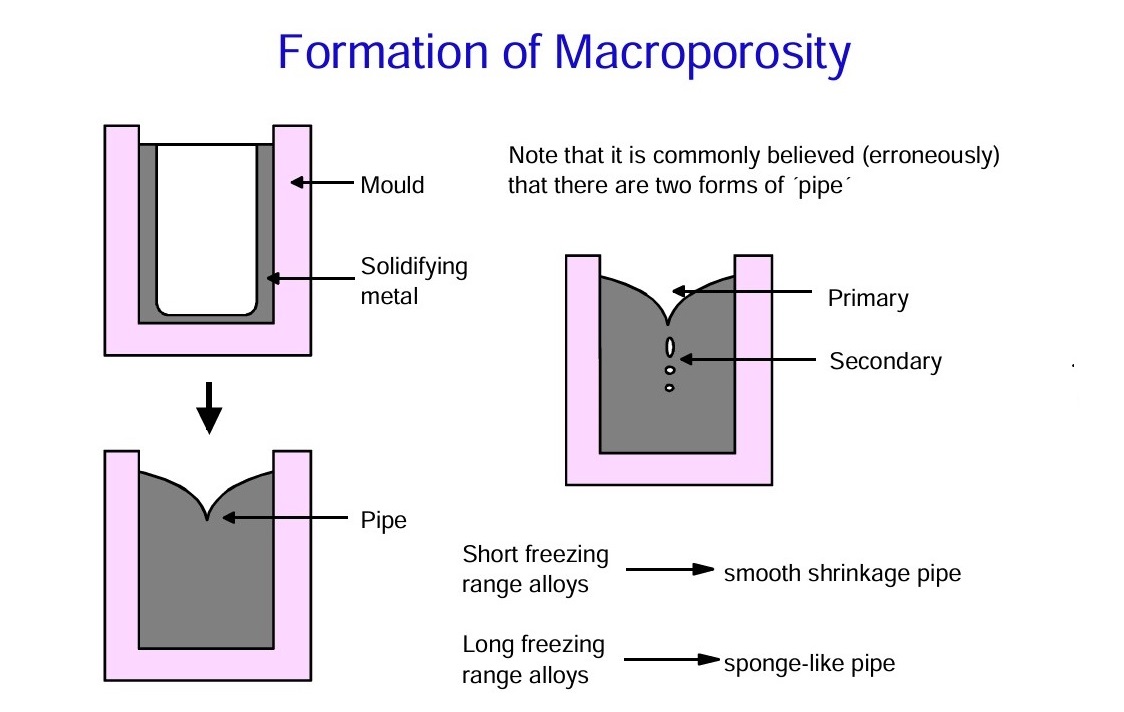 The best known form of macroporosity is the ‘pipe’ formed as a simple ingot of a short freezing range alloy solidifies. Solidification starts along the walls and at a slower rate on the top surface. As progressively more metal solidifies, the volumetric contraction is compensated for by the concurrent sinking of the liquid surface, forming a smooth conical funnel or long ‘tail’ inside the ingot known as shrinkage pipe or piping.